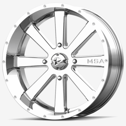 The M34 Flash was exclusively built with lifted machines in mind. Starting at 18”, this unique flared eight spoke design also comes in 20”, 22” and the enormous 24”. Available in both gloss black paint and the heavily requested chrome, the M34 Flash defines a new generation of MSA Offroad Wheels. Available in a variety of fitments for all makes and models of ATVs and UTVs, the M34 Flash is available January 2018. Interchangeable MSA-CAP and center star for full customization. This is next level off-road performance.